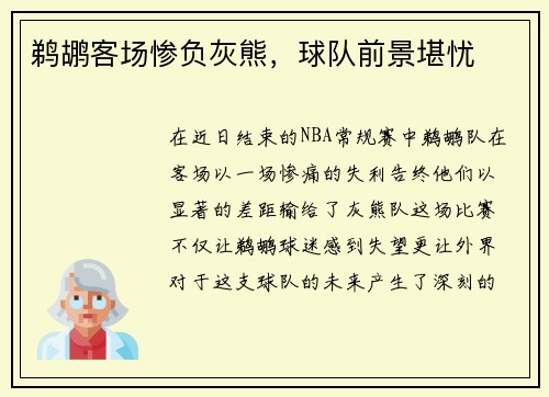 鹈鹕客场惨负灰熊,球队前景堪忧