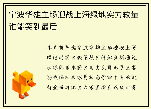 本文将围绕宁波华雄主场迎战上海绿地的实力较量展开详细分析,通过从球队基本实力、历史交锋记录、主客场表现以及球员状态等四个方面进行全面对比,为大家呈现出这场比赛的悬念与看点。作为中超联赛中的两支重要球队,宁波华雄与上海绿地各自拥有强大的阵容与技战术特点,两队在实力上的较量充满变数。究竟谁能够笑到最后,获得胜利呢?我们将在下面的分析中揭示这一谜团。