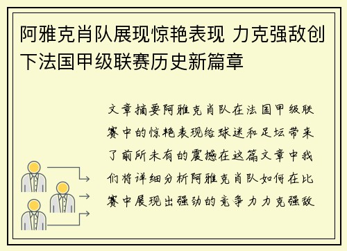 文章摘要:阿雅克肖队在法国甲级联赛中的惊艳表现,给球迷和足坛带来了前所未有的震撼。在这篇文章中,我们将详细分析阿雅克肖队如何在比赛中展现出强劲的竞争力,力克强敌,并创下法国甲级联赛历史的新篇章。文章从球队的整体表现、关键球员的突出贡献、战术体系的成功应用和球队精神的形成四个方面展开,逐一剖析阿雅克肖的成功背后的原因。阿雅克肖队的突破不仅提升了球队的声誉,也为法甲联赛带来了新的竞争格局,成为了新兴的力量。本文旨在通过深入分析,全面解读阿雅克肖队的辉煌表现及其对法甲联赛的深远影响。