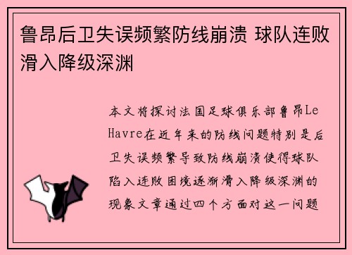 本文将探讨法国足球俱乐部鲁昂(Le Havre)在近年来的防线问题,特别是后卫失误频繁导致防线崩溃,使得球队陷入连败困境,逐渐滑入降级深渊的现象。文章通过四个方面对这一问题进行深入分析:首先,探讨鲁昂后卫失误的频率及其对防线稳定性的影响;其次,分析球队在防守策略上的漏洞以及后卫个人能力的不足;第三,讨论教练战术安排和球队整体防守体系的缺陷;最后,剖析球队连续失利对士气和球队气氛的影响。通过这些方面的剖析,本文试图为鲁昂的防线问题提供全面的解读,并提出可能的解决方案。